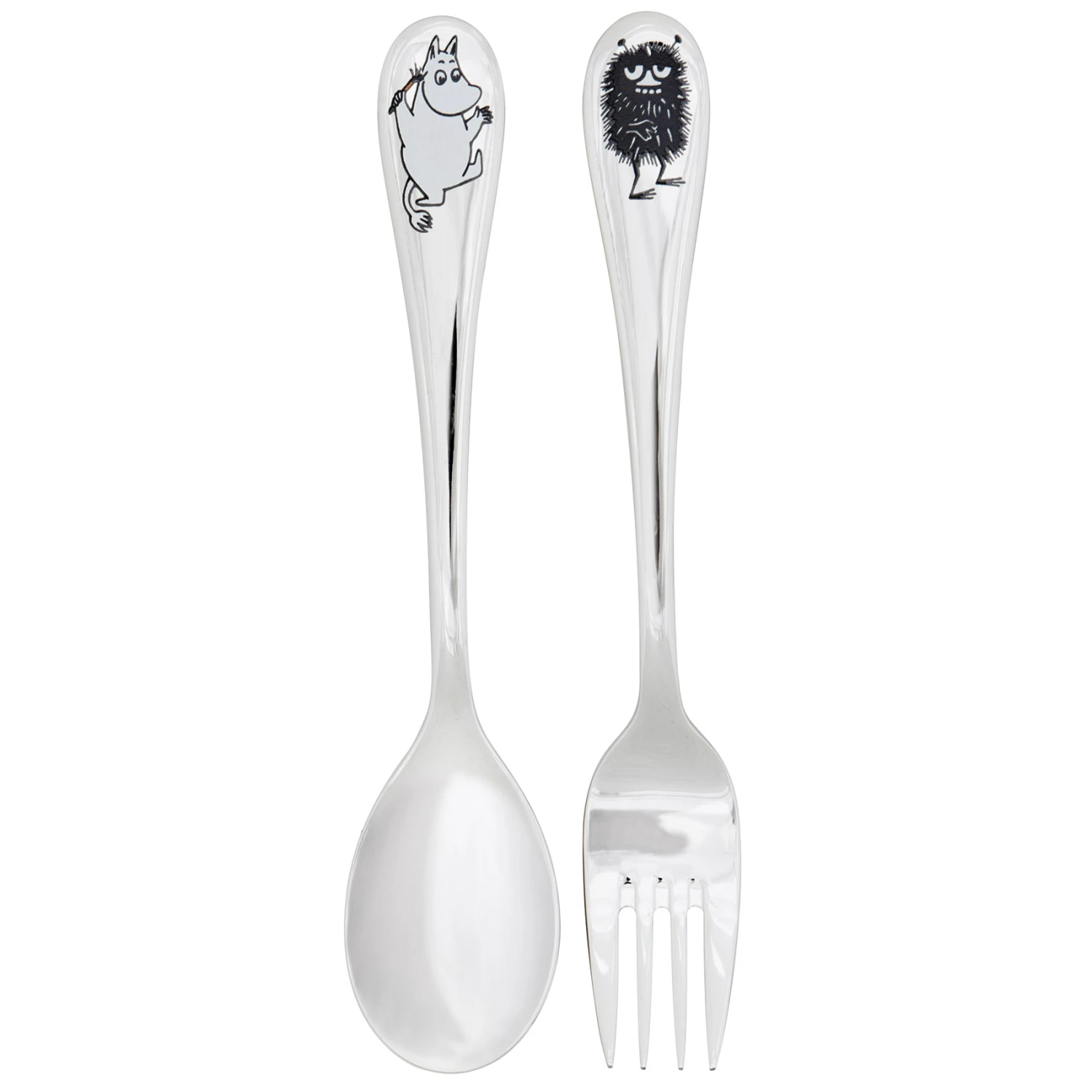 El encantador set de cubiertos infantiles decorados con los personajes de los Mumin (Moomin) es diseño de la marca finlandesa Hackman. El conjunto se compone de tenedor y cuchara, y están hechos en acero inoxidable de alta calidad. Un set de cubiertos que encantará a los más pequeños y que es ideal para regalar. Combina los cubiertos con el resto de menaje de cocina y mesa de los personajes de los Mumin.