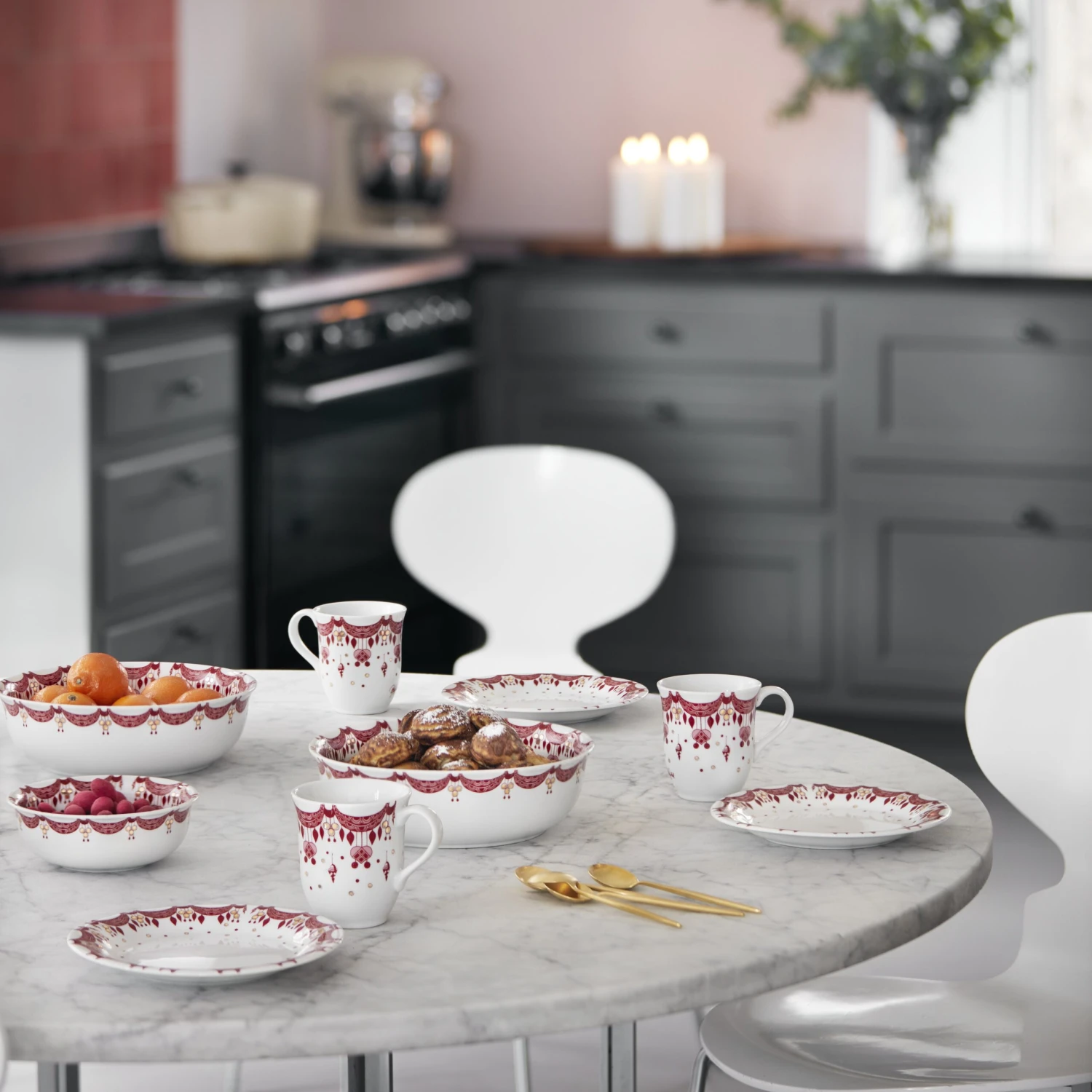 Sirve tu té o café esta Navidad en esta bella taza, diseñada por el artista danés Bjørn Wiinblad. La decoración de la taza se aplica a mano, y en ella podemos apreciar guirnaldas y otros adornos navideños en colores rojo y dorado. Haz coincidir la taza con el bol y plato a juego de la misma colección de Navidad.